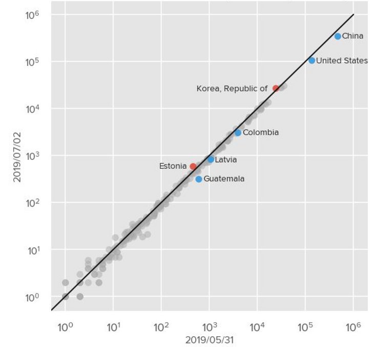 Die Grafik unten zeigt die Anzahl der anfälligen Systeme nach Ländern geordnet, wobei die X-Achse die Anzahl Ende Mai und die Y-Achse die Anzahl Anfang Juli darstellt. Das Streudiagramm nutzt logarithmische Skalen, daher ist die prozentuale Veränderung für jedes Land in absoluten Werten größer, als das Diagramm sie erscheinen lässt. Die schwarze Linie stellt eine lineare Standardregression dar und ein Punkt auf der Linie würde keine Änderung im beobachteten Zeitraum bedeuten.