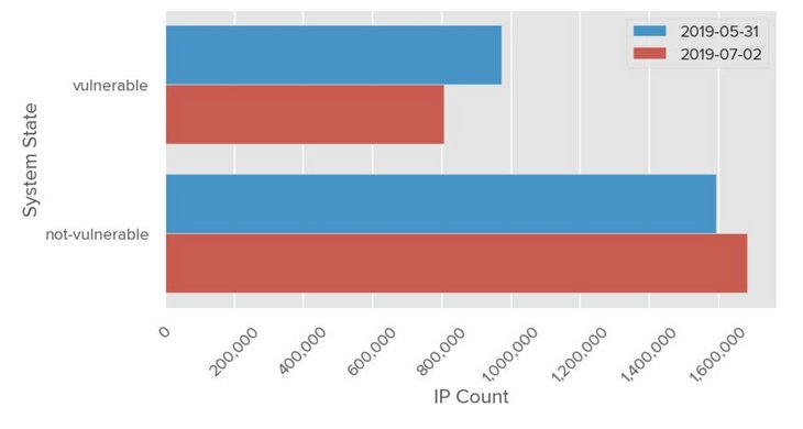 Im Vergleich zum Stand vom 31. Mai ist die Zahl der für BlueKeep anfälligen Systeme bis zum 2. Juli um 17,18 Prozent gesunken. Das entspricht 167.164 gepatchten Systemen. Weltweit waren am 2. Juli noch 805.665 Systeme online, die für die Sicherheitslücke anfällig sind.