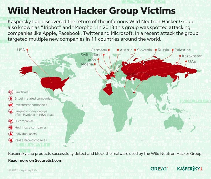 "Bei Wild Neutron handelt es sich um eine erfahrene und ziemlich vielseitige Gruppe, die seit 2011 aktiv ist und seitdem mindestens einen Zero-Day-Exploit, maßgeschneiderte Malware sowie Tools für Windows und OS X nutzt", so Costin Raiu, Director Global Research and Analysis Team bei Kaspersky Lab. "Obwohl die Gruppe in der Vergangenheit einige der bekanntesten Unternehmen der Welt angegriffen hat, hat sie es geschafft, sich über zuverlässige Sicherheitsprozesse im Hintergrund zu halten. Dass die Gruppe große IT-Unternehmen, Spyware-Entwickler (FlexiSPY), Foren von Dschihadisten (das "Ansar Al-Mujahideen English Forum”) sowie Bitcoin-Unternehmen im Visier hat, weist auf flexible und unübliche Interessen hin."