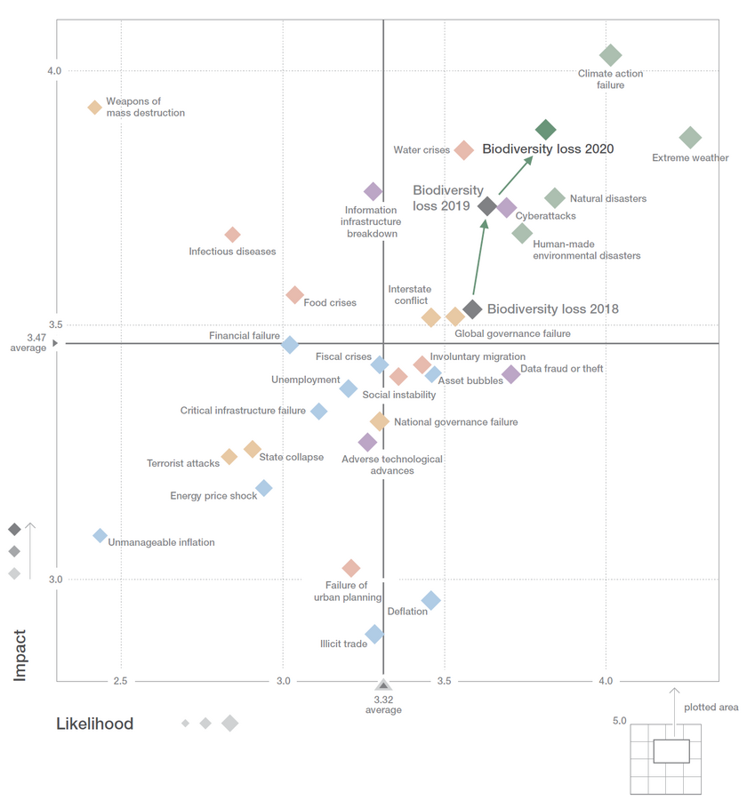 Figure 02: The Global Risks Landscape 2020 and the evolution of the biodiversity loss risk in the past three years [Source: World Economic Forum]Figure 02: The Global Risks Landscape 2020 and the evolution of the biodiversity loss risk in the past three years [Source: World Economic Forum]