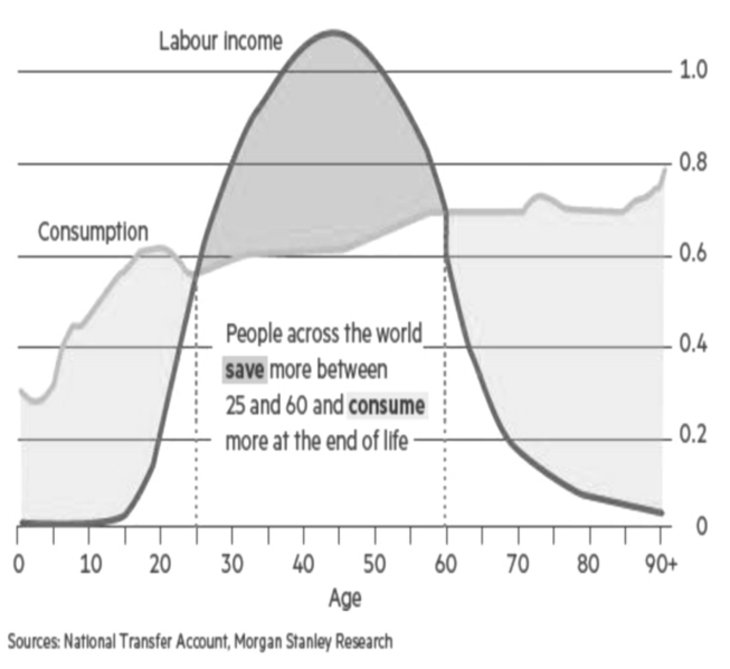 Erstens: Es ist gar nicht so sicher, dass Inflation und Zinsen mit zunehmender Alterung der Gesellschaft sinken. Es ist zwar richtig, dass ältere Menschen nicht mehr so viel konsumieren. Aber in Relation zu ihrem Einkommen (das immer kleiner wird) ist ihr Verbrauch wesentlich höher als der der Erwerbstätigen. Siehe dazu die Grafik zum Lebenszyklus von Einkommen und Verbrauch, die aus einer Studie des britischen Ökonomen Charles Goodhart stammt. Je größer die Generation der über 60-jährigen in der Gesellschaft, umso größer daher die Konsumquote der Volkswirtschaft.