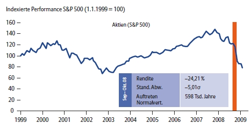 Dieses Modell der Wahrscheinlichkeitsverteilung blendet sogenannte "Fat Tail Risks" (extreme Risiken, die mittels Normalverteilung nicht ausreichend berücksichtigt werden) bei den erwarteten Kursveränderungen weitestgehend aus: ein Fehler. Wer seine Risiken nach der Normalverteilungsannahme steuert, rechnet mit einem Crash, wie er im September / Oktober 2008 bei den europäischen Unternehmensanleihen schlechter Bonität vorkam, nur alle 247.000.000 Jahre. Auch der zeitgleiche Absturz des S&P 500 käme so betrachtet nur alle ca. 600.000 Jahre vor (vgl. Abbildung 5). Wie schnell doch die Zeit vergeht. Dabei ist die Geschichte der Finanzmärkte auch die Geschichte der Finanzmarktkrisen.