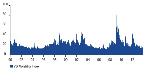 Schwache Börsentage treten in Krisenzeiten gehäuft auf. Kein Wunder, denn ist das Vertrauen der Anleger erst einmal gebrochen, braucht es meist eine geraume Zeit, bis der nächste Aufschwung kommt. Übertragen heißt das: Märkte besitzen ein Gedächtnis, sodass die Annahme, dass Kursveränderungen statistisch unabhängig sind, nur eingeschränkt gilt. Im Gegensatz zum Münzwurf spielt die vorausgegangene Kursänderung an den Kapitalmärkten eine Rolle, wie sich sehr schön am Volatilitätsindex VIX (berechnet auf Basis des S&P 500) in Abbildung 6 erkennen lässt. Sind die Marktturbulenzen ausgeprägt, so ist die Wahrscheinlichkeit groß, dass auch in der Folgeperiode mit einer hohen Volatilität an den Märkten zu rechnen ist. Phasen erhöhter Kursschwankungen treten immer wieder konzentriert auf – wie gerade auch wieder in jüngster Zeit zu sehen war.