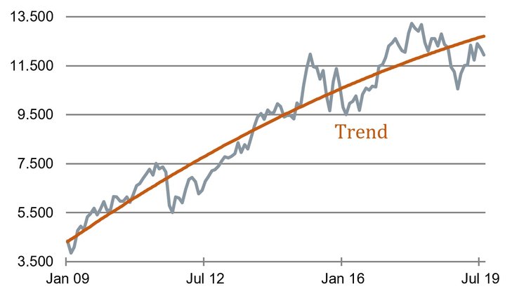 In jedem Fall ist festzuhalten, dass der Aufwärtstrend des DAX seit dem Tiefpunkt im März 2009 ungebrochen ist (siehe Grafik). Protektionismus und populistische Tendenzen in vielen Ländern haben ihn nicht brechen können. Das hat mich überrascht. Es sieht so aus, als bewahrheite sich der alte Spruch, dass politische Börsen kurze Beine haben. Das ist eine gute Ausgangsbasis für die kommende Entwicklung.