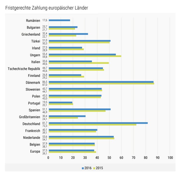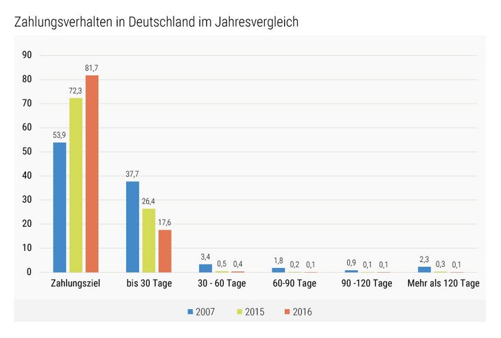 Besonders kleine Unternehmen aus Deutschland verhalten sich in Sachen Zahlungsverhalten vorbildlich. Firmen mit bis zu fünf Angestellten sind in Deutschland die besten Schuldner. 73,3 Prozent der Kleinstunternehmen zahlten 2016 ihre Rechnung ganz pünktlich. Und knapp 25 Prozent bewegten sich immerhin noch im Zahlungszeitraum von bis zu 30 Tagen. Es folgen Unternehmen mit bis zu 50 Mitarbeitern mit einem Anteil von 70,1 Prozent, die innerhalb des Zahlungszieles zahlen. Bei den mittelgroßen Unternehmen (50 bis 260 Mitarbeiter) beträgt die Quote noch 56,6 Prozent, die großen Unternehmen mit mehr als 260 Beschäftigten nehmen sich mehr Zeit; nur 42,6 Prozent der Firmen begleichen die Rechnung pünktlich.