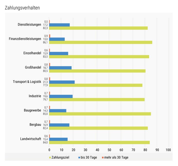 Säumige Zahler findet man dagegen am häufigsten im Transportsektor und in der verarbeitenden Industrie. Nur 77,9 Prozent der Unternehmen aus der Transportbranche zahlten im Untersuchungszeitraum ihre Rechnungen innerhalb des Zahlungsziels. Bei den Firmen der verarbeitenden Industrie lag die Quote bei 79,7 Prozent. Im Durchschnitt aber zahlten die meisten Branchen im Vergleich zu den vergangenen zwölf Monaten ihre Rechnungen pünktlicher. Von allen analysierten Branchen verzeichneten Unternehmen aus dem Bereich Transport und Logistik die größte Verbesserung im Zahlungsverhalten.