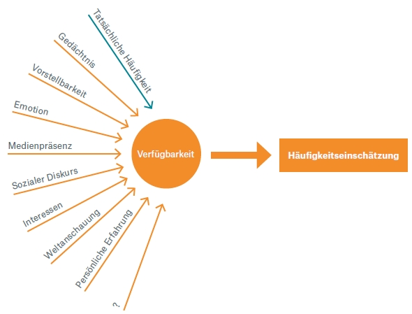 Abbildung 1: Verfügbarkeitsheuristik: Die Verfügbarkeit eines Ereignisses wirkt sich auf die Beurteilung der Häufigkeit des Ereignisses aus, ist aber abhängig von zahlreichen weiteren Faktoren.