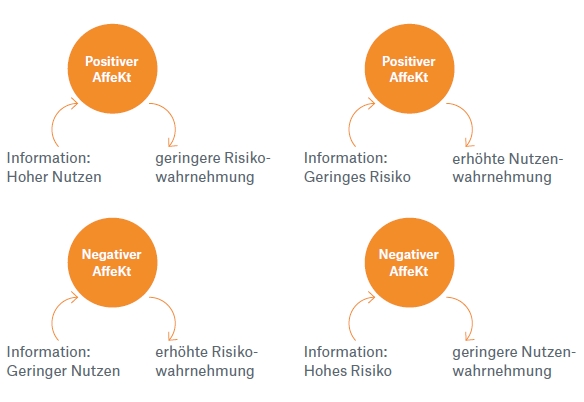 Abbildung 2: Affektheuristik (nach Slovic, Finucane, Peters, & MacGregor, 2004): Wir nehmen häufig fälschlicherweise einen negativen Zusammenhang zwischen Nutzen- und Risikohöhe an, der über Affekt vermittelt wird.
