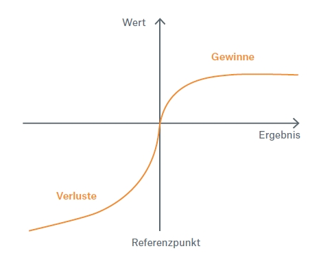 Für den Verkauf von Aktien ist der Einstandspreis oft wichtiger als die Kursentwicklung (Arkes & Blumer, 1985; Brockner, 1992; Staw, 1997). Eine Erklärung für den Sunk Cost Effekt liefert die von Daniel Kahneman und Amos Tversky (1979) entwickelte Prospect Theory. Demnach beruhen menschliche Entscheidungen zu einem beachtlichen Ausmaß auf der subjektiven Wahrnehmung von Verlusten und Gewinnen. Da eine höhere Sensitivität für Verluste als für Gewinne besteht, wird bei der Entscheidungsfindung wie folgt vorgegangen: Zunächst wird ein Referenzpunkt für potentielle Verluste oder Gewinne festgelegt. Anschließend entscheiden sich Menschen üblicherweise für die Alternative mit dem höchsten Wert, wobei Verluste jedoch stärker gewichtet werden als Gewinne (siehe Abbildung 3). Die resultierende Wertfunktion ist konkav für Gewinne, konvex für Verluste und steiler bei Verlusten als bei Gewinnen. Dies bedeutet, dass Verlustsituationen einen hohen Risikoappetit begünstigen und Gewinnsituationen eher Risikoaversion Vorschub leisten. Die Prospect Theory erklärt den Sunk Cost Effekt wie folgt: Bereits getätigte Investitionen können als Verluste betrachtet werden.