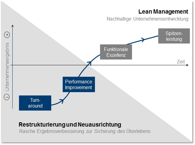Deswegen muss ein systematischer Entwicklungsprozess im Unternehmen etabliert werden. Damit nach der akuten Restrukturierungsphase das Unternehmen nicht wieder in altgewohnte Arbeitsweisen verfällt, ist auch das Führungssystem neu aufzustellen. Die Einführung eines "Shopfloor-Managements" verbessert die Führungsqualität dauerhaft, indem es auf die konsequente Übernahme der Führungsverantwortung am Ort der Wertschöpfung besteht. Die Führungskräfte sind in allen Bereichen präsent und erkennen Fehlentwicklungen früher. So werden Entscheidungen beschleunigt und Lösungen direkt umgesetzt.