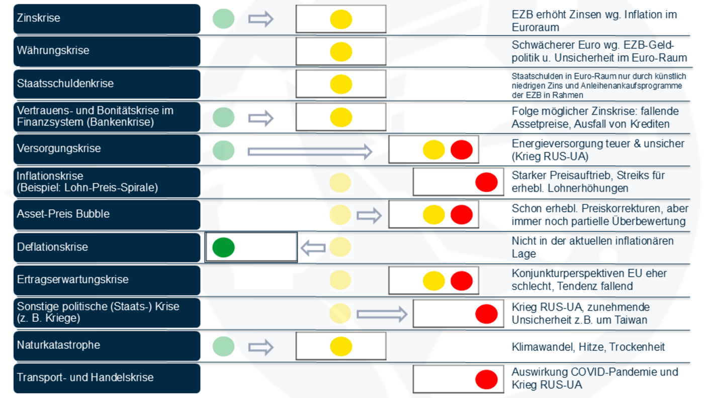 Dabei ist zu beachten, dass sich eine Inflationskrise nicht nur direkt auf die wirtschaftliche Entwicklung negativ auswirken kann, sondern dass diese das Eintreten von Folgekrisen fördert. So kann ein Preisauftrieb die Wahrscheinlichkeit einer Zinskrise erhöhen (beispielsweise bedingt durch Maßnahmen der Zentralbanken zur Inflationsbekämpfung und Reaktionen der Kapitalgeber auf sich erhöhende Inflationserwartungen). Damit war spätestens im Jahr 2022 klar, dass sich Unternehmen möglichst frühzeitig auf eine rasche und starke Erhöhung der Zinssätze vorbereiten müssen, was in den Status Gelb (und Begründung) bei der Zinskrise mündete. Zudem hätte die Möglichkeit einer sich weiter verschärfenden Währungs- und Staatsschuldenkrise – als weitere optionale Folgekrisen – in die unternehmensspezifische Entscheidungsfindung mit einbezogen werden müssen.