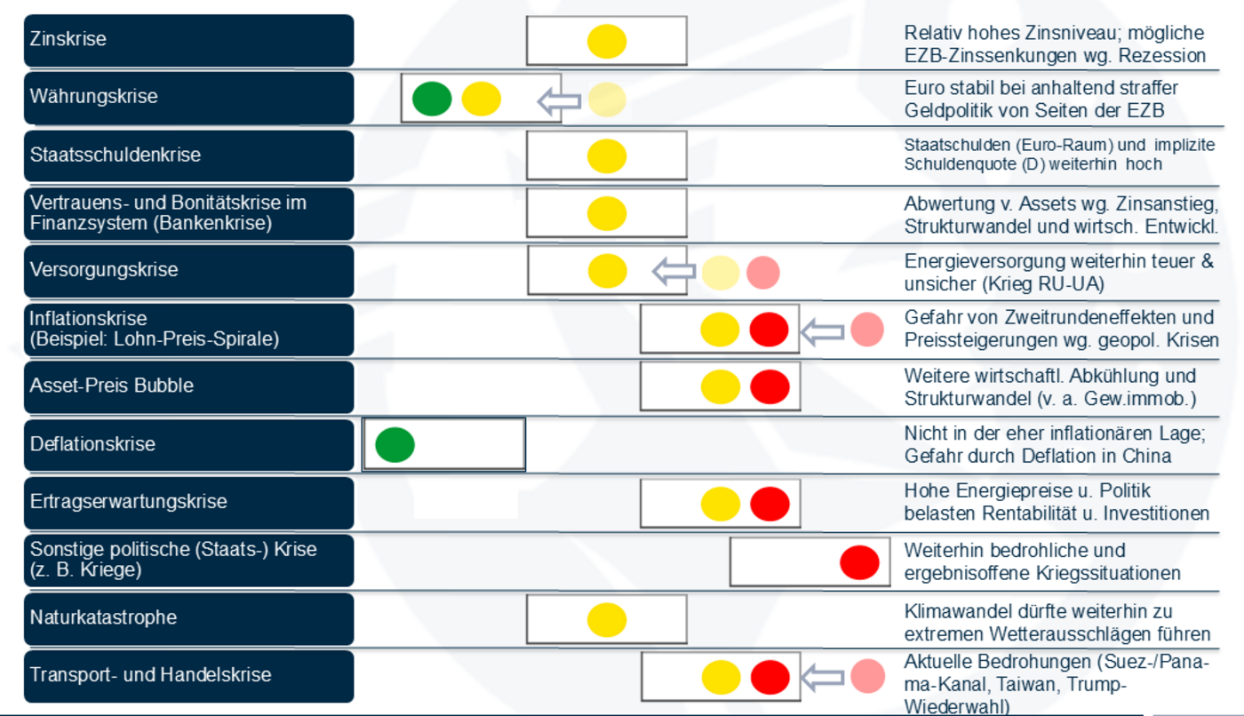 Auf den ersten Blick zeigt sich eine Verbesserung der Situation gegenüber dem Jahr 2022. Viele Risiken haben sich leicht abgeschwächt. Mit 9 von 12 Krisen im gelben oder gelb-roten Bereich ist das Gefahrenpotenzial jedoch weiterhin hoch. Größte Beachtung sollte insbesondere Ampeln geschenkt werden, die sich von grün auf gelb entwickeln, um bei möglicher weiterer Verschlechterung schnell handlungsfähig zu sein.