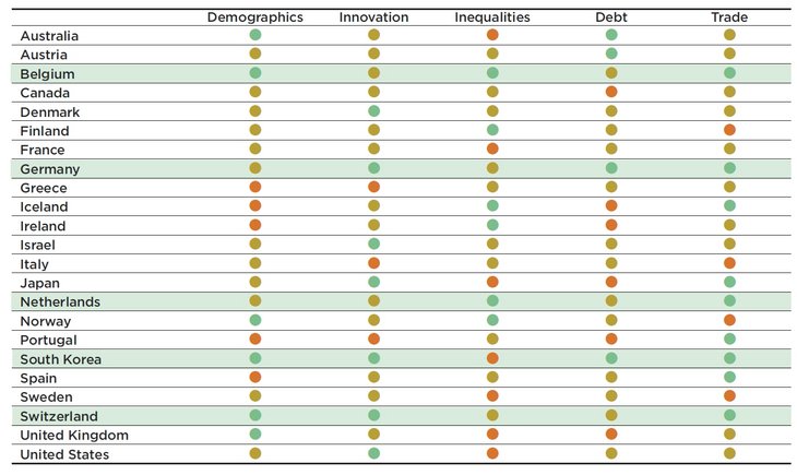 Um aus dreiundzwanzig Industrieländern jene herauszufiltern, die das geringste Risiko für eine lang anhaltende Wachstumsschwäche oder gar eine Phase der wirtschaftlichen Stagnation aufweisen, haben Coface-Analysten fünf Kriterien herangezogen: