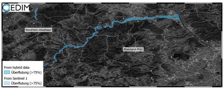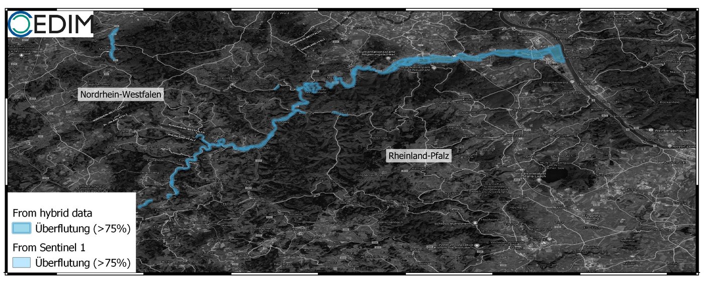 Um die Überflutungsflächen in den am schwersten betroffenen Gebieten Kreis Ahrweiler und Rhein-Erft-Kreis abzuschätzen, kombinierte das Forschungsteam Satellitendaten mit Luftaufnahmen von (Amateur-)Drohnen und Helikoptern sowie Fotos aus sozialen Medien. Nach diesen geschätzten Überflutungsflächen befinden sich in den betroffenen Gebieten knapp über 19 000 Gebäude mit einem Wert von rund neun Milliarden Euro. In Verbindung mit empirischen Daten vergangener Hochwasserkatastrophen (Infrastrukturschäden, Elementarschäden und andere Schäden) schätzten die Forschenden einen Gesamtschaden zwischen elf und 24 Milliarden Euro (erste CEDIM-Schätzung: 21. Juli 2021). Dabei ist allerdings zu berücksichtigen, dass die Überflutungsflächen nur einen Teil der gesamten betroffenen Fläche ausmachen.