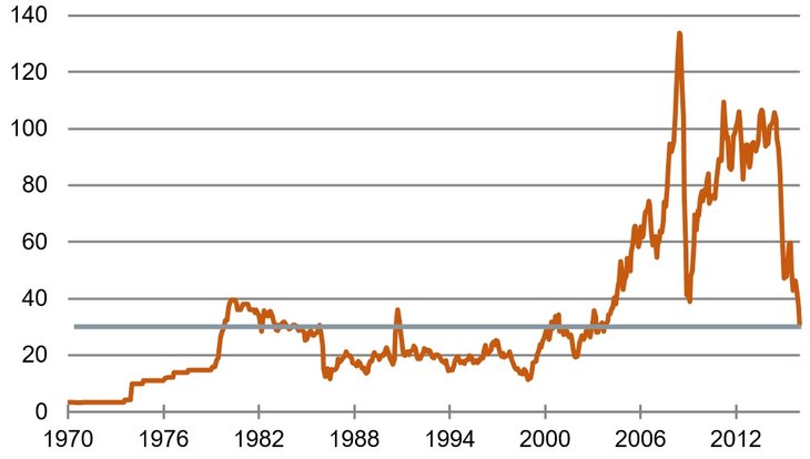 Um die neuen Risiken zu verstehen, muss man sich die langfristige Perspektive anschauen. Der Ölpreis liegt heute mit 31 Dollar je Barrel auf dem Niveau der Zeit der zweiten Ölkrise vor 35 Jahren (siehe Grafik). Das ist für sich genommen schon ungeheuerlich. Berücksichtigt man dazu aber noch die zwischenzeitliche allgemeine Geldentwertung, so ist der Ölpreis heute mit real etwas mehr als fünf Dollar je Barrel so hoch wie vor der ersten Ölkrise 1973. Das machen sich viele nicht klar. Ich war selbst überrascht, als ich mir diese Zahlen angeschaut habe.