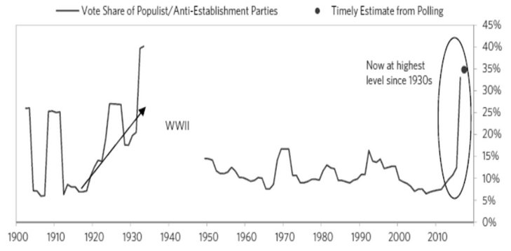 Erschreckend ist das Tempo des Vormarsches des Populismus. Die Grafik, die aus der Studie von Bridgewater stammt, zeigt den Stimmenanteil populistischer Parteien bei den allgemeinen Wahlen in den Industrieländern. Während der gesamten Nachkriegszeit war dieser Anteil relativ gering. Er schwankte um die 10 Prozent bis 15 Prozent (mit gewissen Ausreißern Anfang der 70er und der 90er Jahre). Das war ungefährlich. In letzter Zeit ist er aber geradezu nach oben geschossen. Zuletzt lag er bei 35 Prozent. Das ist wie ein Tsunami. Wohin man schaut, sprießen populistische Tendenzen. Besonders nachdenklich macht die linke Hälfte der Grafik. Sie zeigt die Stimmenanteile populistischer Parteien in der ersten Hälfte des 20. Jahrhunderts. In den 30er Jahren ging der Populismus genauso wie heute nach oben. Wir alle wissen, was daraus wurde.