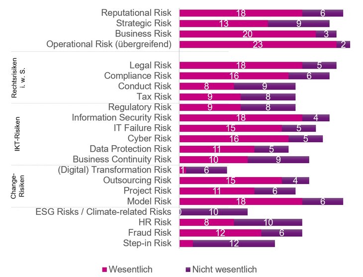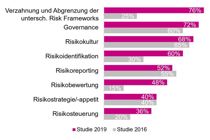 Die Landkarte der Risiken in Banken wird zusehends differenzierter. Risikoarten, die in der Studie aus dem Jahr 2016 noch gar nicht präsent waren (wie beispielsweise Step-in Risk), sind in einigen Instituten bereits als wesentliche Risiken im Rahmen der Risikoinventur identifiziert worden.