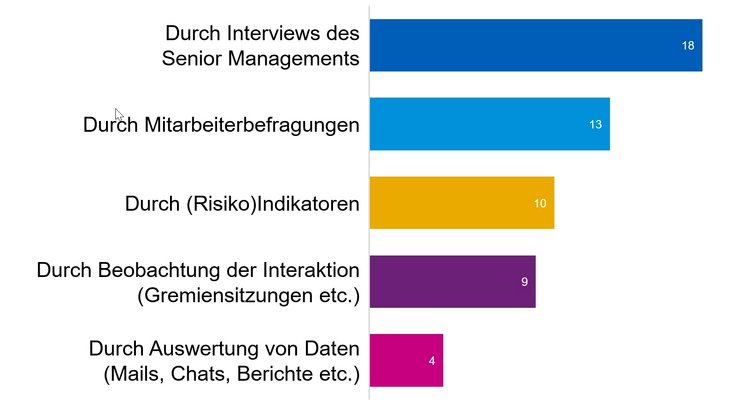 Die Erhebung einer Ist-Risikokultur ist entscheidend, um Veränderungsbedarfe identifizieren und gezielt umsetzen zu können. Befragungen von bzw. Interviews mit Führungskräften bzw. Mitarbeitern sind die verbreitetsten Methoden. Mehr als ein Drittel der Befragten erwähnt zudem die Beobachtung der Interaktion von Entscheidungsträgern (wie sie beispielsweise von der niederländischen Zentralbank eingesetzt wird).