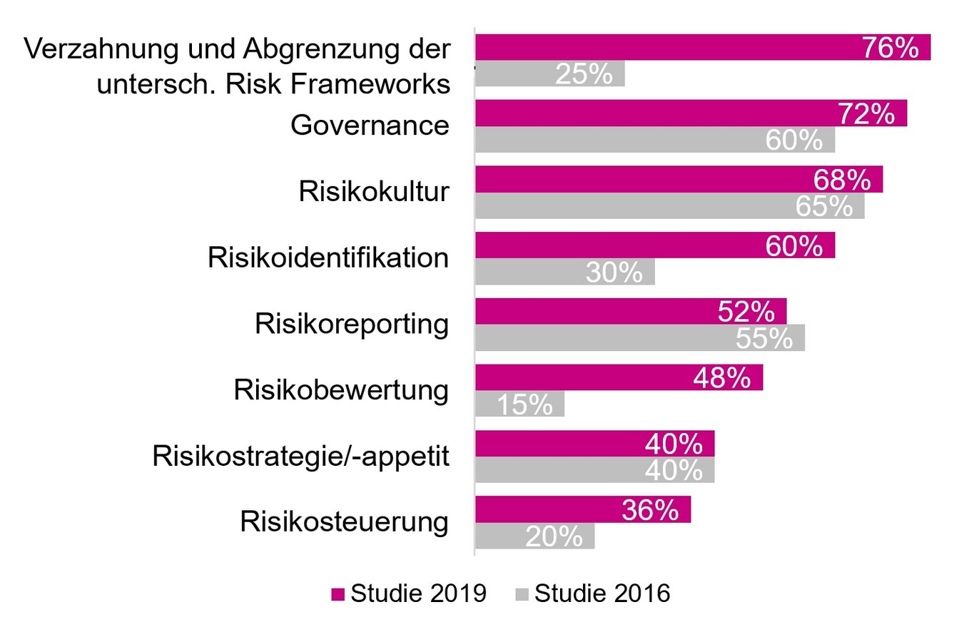Alle in der Studie von 2016 genannten Schwerpunkte der Weiterentwicklung des NFR-Frameworks sind in der Branche weiterhin relevant. Dies spricht möglicherweise dafür, dass der erforderliche Grad der Änderungen höher als antizipiert ist und somit Veränderungsprozesse noch nicht abgeschlossen sind. Den größten Bedeutungszuwachs hat die Verzahnung der verschiedenen Risiko-Frameworks der Einzelkategorien erfahren. Während dieses Thema 2016 nur von einem Viertel der Befragungsteilnehmer genannt wurde, ist dieses nun der Spitzenreiter mit mehr als drei Vierteln. Auch Risikoidentifikation, -bewertung und steuerung konnten deutlich an Bedeutung gewinnen.