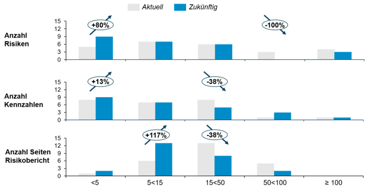 Elementarer Bestandteil eines funktionierenden Risikomanagements ist neben der Identifizierung und Analyse von Risiken auch die transparente und vollständige Berichterstattung. Die Befragten äußerten, dass zum einen die Frequenz zunehmen soll. In vielen Unternehmen findet die Risikoberichterstattung einmal pro Jahr statt, was oftmals zu wenig Spielraum für Gegenmaßnahmen bietet. Zum anderen soll die Komplexität der Berichte zurückgehen. Anzahl der berichteten Risiken, Risikokennzahlen und vor allem die Seitenanzahl der Risikoberichte sollen nach Meinung der Experten sinken, wie Abb. 03 zu entnehmen ist. Adressatengerechte Dashboards mit Login-Funktion, die mit relevanten Informationen auf den Empfänger zugeschnitten sind und anlassbezogen kommunizieren, stellen eine praktische Lösung da.