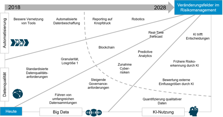 Der Begriff Digitalisierung ist wie in allen Unternehmensbereichen und somit auch im Risikomanagement allgegenwärtig. Maschinengestützte Real-Time-Analysen, Künstliche Intelligenz und Frühwarnsysteme sind nur einige Beispiele der Handlungsfelder, die Unternehmen in den nächsten Jahren im Risikomanagement angehen sollten. Mit der zunehmenden digitalen Vernetzung werden zudem Cyberrisiken verstärkt in den Fokus rücken und Kompetenzen für IT-Sicherheits-Management-Systeme aufgebaut. Vermehrt treten zudem regulatorische Anforderungen in Folge der Digitalisierung auf. Die EU-DSGVO zeigt, dass sich neben Chancen auch Risiken der Digitalisierung konkretisieren.