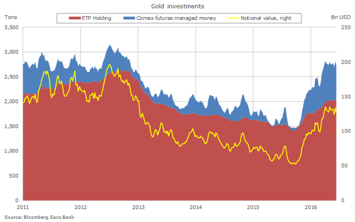 Combining the two investor groups, we find that total holdings in gold (at 2,730 tonnes) are only 13% below their 2012 peak, not least due to the record position being held by tactical traders in the futures market.