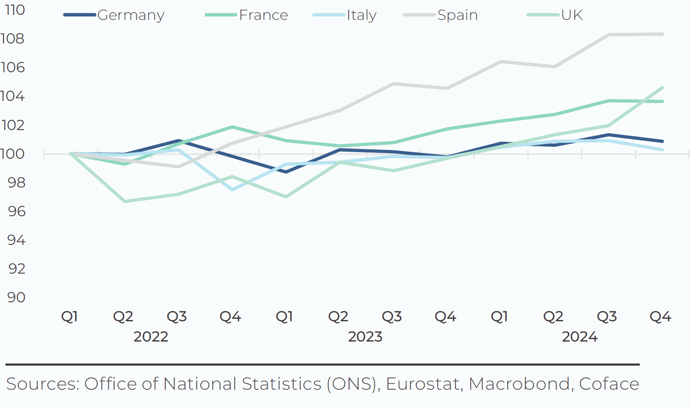 France suffers from stagnant consumption and investment reluctance (see Figure 03). A significant upswing is not expected before 2027. Italy’s economy is hindered by its dependence on the U.S. market, whereas Spain benefits from tourism, immigration, and EU funding. In the UK, tax hikes burden the economy, but reform projects and rate cuts may bring medium-term stability.