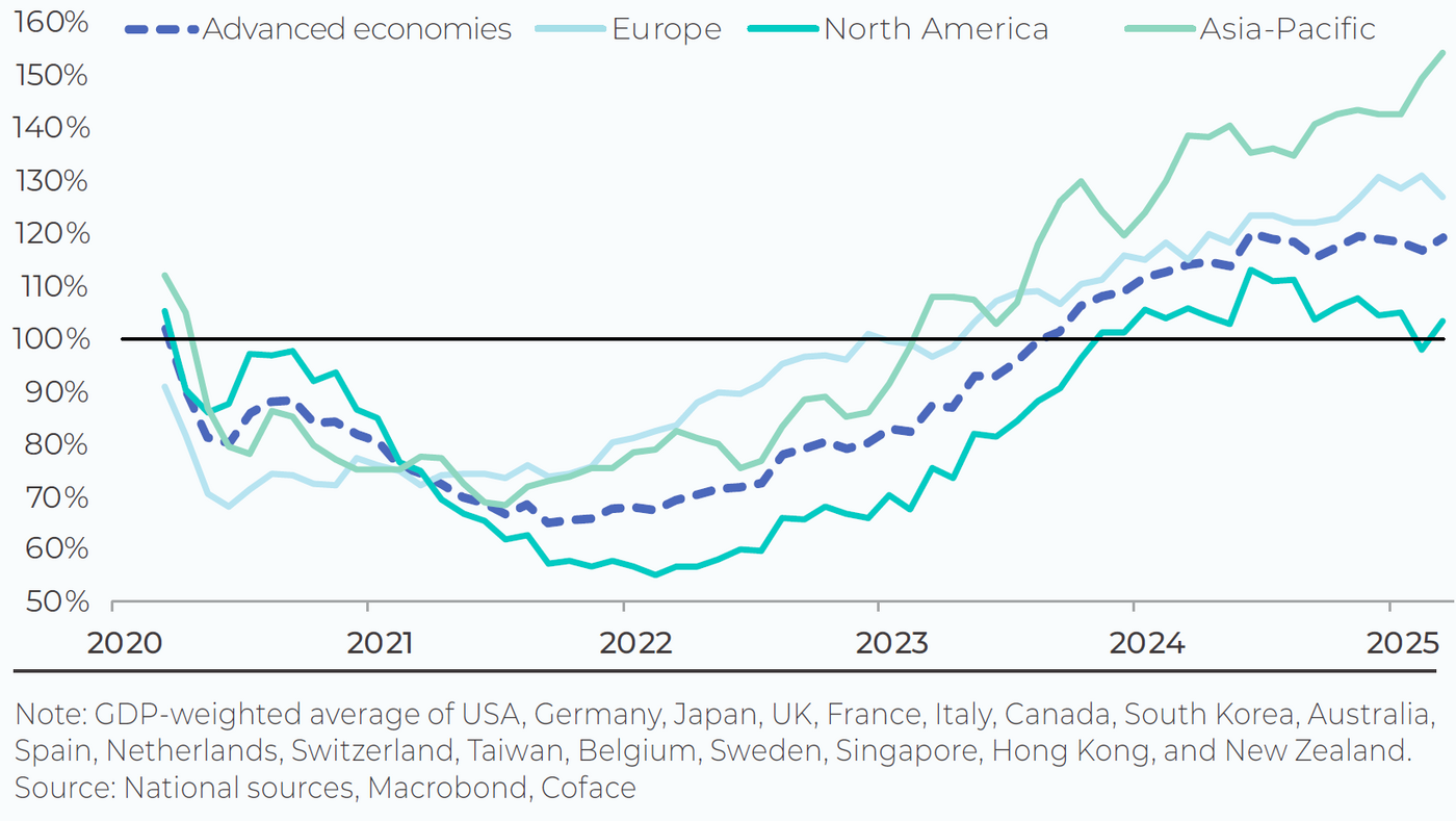 Corporate insolvencies remain a major concern in 2025. The pandemic-era exception of low insolvency rates is definitively over. In over 80 percent of developed economies, insolvencies are now above pre-2019 levels. Japan, Australia, and several European countries are particularly affected (see Figure 06).