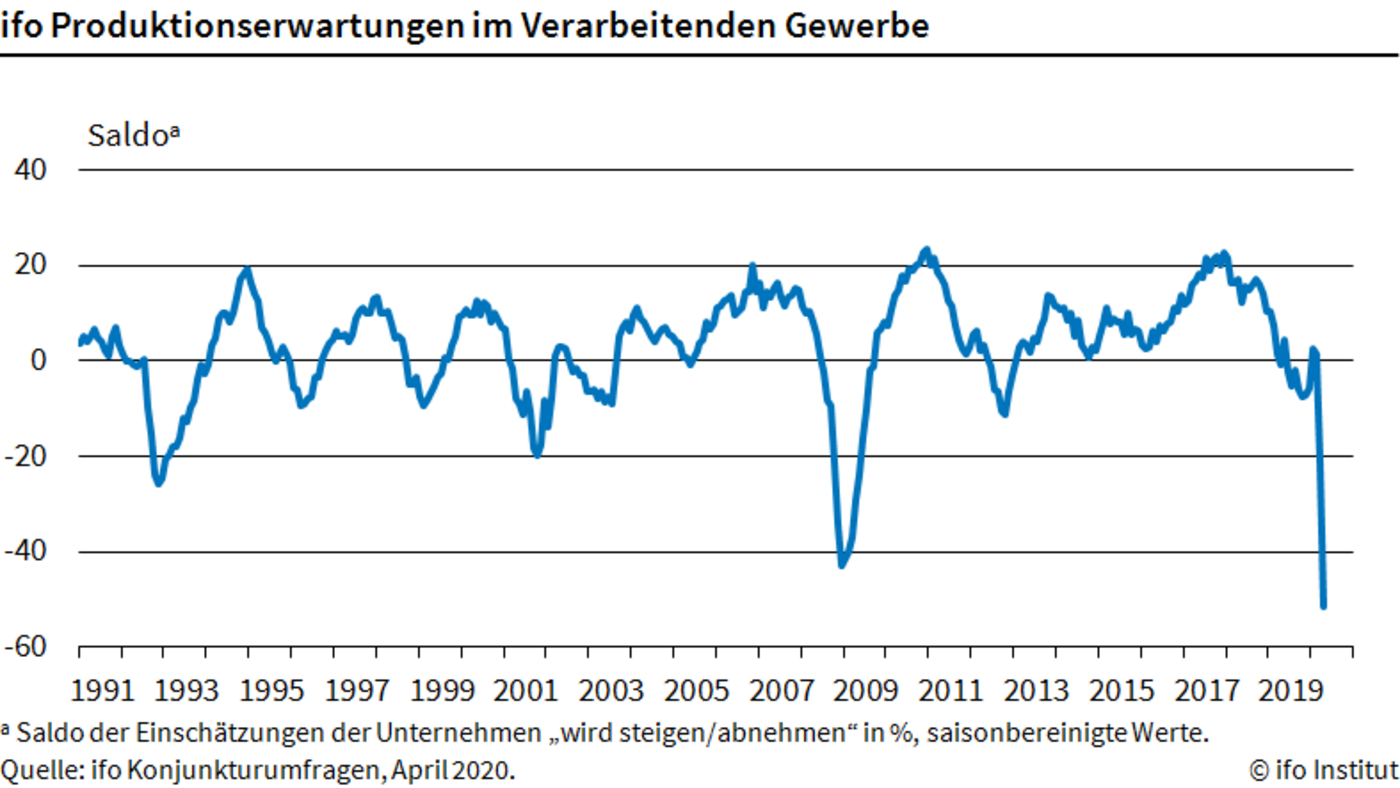 Die deutsche Industrie erwartet einen noch nie dagewesenen Einbruch ihrer Produktion. Der entsprechende ifo-Index für die kommenden drei Monate stürzte im April auf minus 51,4 Punkte, von minus 21,4 im März. Das ist der tiefste Punkt seit der Wiedervereinigung. Im Dezember 2008 lag der Index bei minus 42,9 Punkten. Der Rückgang ist mit minus 30,0 Punkten noch einmal stärker ausgefallen als im März mit minus 22,7 Punkten. "Das Tal der Produktion wird immer tiefer", sagt dazu der Leiter der ifo-Befragungen Klaus Wohlrabe.