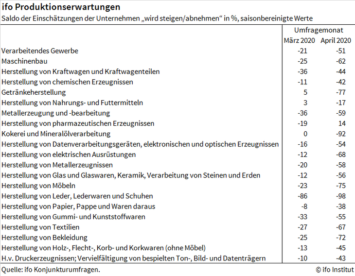 In der Getränkeherstellung fiel der Produktionsindex auf minus 77 Punkte im April, nach plus fünf im März. Noch schlechter sind die Erwartungen in der Herstellung von Leder, Lederwaren und Schuhen. Der Index fiel im April weiter auf minus 98 Punkte, nach minus 86 im März. Auch die Hersteller von Möbeln, Bekleidung, Glaswaren oder elektrischen Ausrüstungen blicken überaus pessimistisch in die Zukunft.