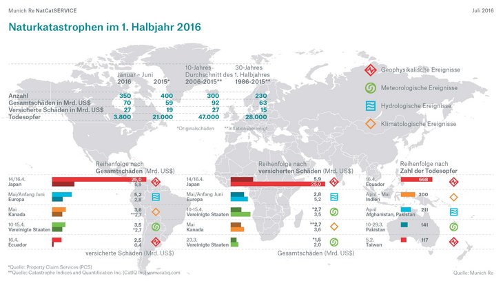 Naturkatastrophen haben im 1. Halbjahr 2016 deutlich höhere Schäden als im Vorjahr verursacht. Insgesamt betrugen die Schäden bis Ende Juni 70 Mrd. US-Dollar (Vorjahr 59 Mrd. US-Dollar), davon waren 27 Mrd. US-Dollar (Vorjahr 19 Mrd. US-Dollar) versichert. Schadentreiber waren schwere Erdbeben in Japan und Ecuador, Unwetter in Europa und den USA sowie Waldbrände in Kanada.