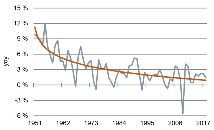 Die Grafik zeigt zweierlei. Das eine ist, dass das Produktionspotenzial keine Konstante ist, sondern sich im Zeitablauf entsprechend dem gesamtwirtschaftlichen Umfeld verändert. In der Zeit des Wiederaufbaus nach dem zweiten Weltkrieg ist es noch jährlich um rund 6,0 Prozent p. a. gewachsen. Inzwischen nimmt es nur noch um 1,0 Prozent bis 1,5 Prozent p. a. zu. Das hat nichts damit zu tun, dass die Menschen fauler geworden sind. Es gibt ganz einfach weniger Arbeit, Kapital und technisches Wissen, auf das sie zurückgreifen können. An diesen 1,0 Prozent bis 1,5 Prozent muss man das aktuelle Wachstum messen.