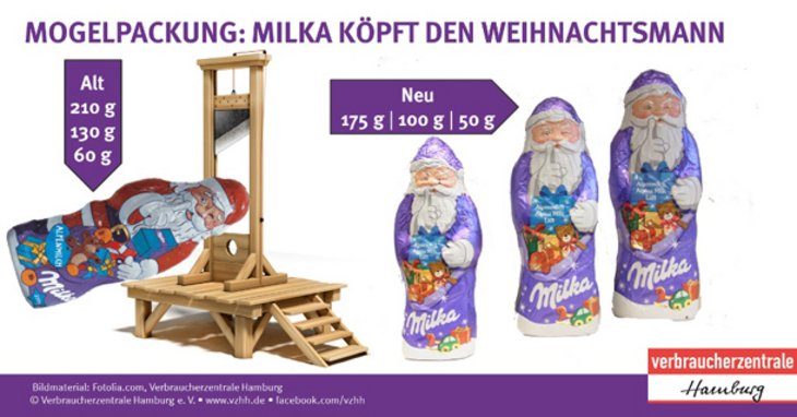 Der Milka Weihnachtsmann von Mondelez wurde "einen Kopf kürzer" gemacht: Je nach Größe wiegt er nun bis zu 23 Gramm weniger. Das verteuert das Produkt um rund 20 Prozent [Bildquelle: Verbraucherzentrale Hamburg].