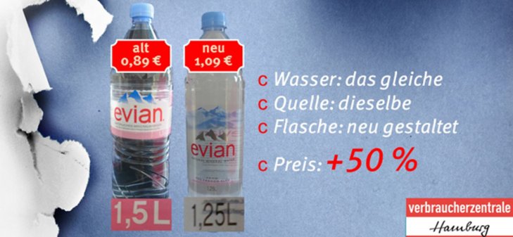 ![Danone Waters hatte die Füllmenge der neuen Evian-Flasche im April 2016 von 1,5 auf 1,25 Liter reduziert. Gleichzeitig wurde der Preis für das Mineralwasser im Handel angehoben: Die teils versteckte Preiserhöhung betrug in einigen Supermärkten bis zu 50 Prozent [Bildquelle: Verbraucherzentrale Hamburg]. Danone Waters hatte die Füllmenge der neuen Evian-Flasche im April 2016 von 1,5 auf 1,25 Liter reduziert. Gleichzeitig wurde der Preis für das Mineralwasser im Handel angehoben: Die teils versteckte Preiserhöhung betrug in einigen Supermärkten bis zu 50 Prozent [Bildquelle: Verbraucherzentrale Hamburg].](/fileadmin/_processed_/7/5/csm_20170213_Evian_Schiller_5973171632.jpg)