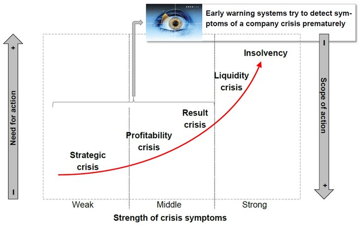 Fig. 01: The typical course of a crisis starting with "weak signals" and ending with insolvencyFig. 01: The typical course of a crisis starting with "weak signals" and ending with insolvency