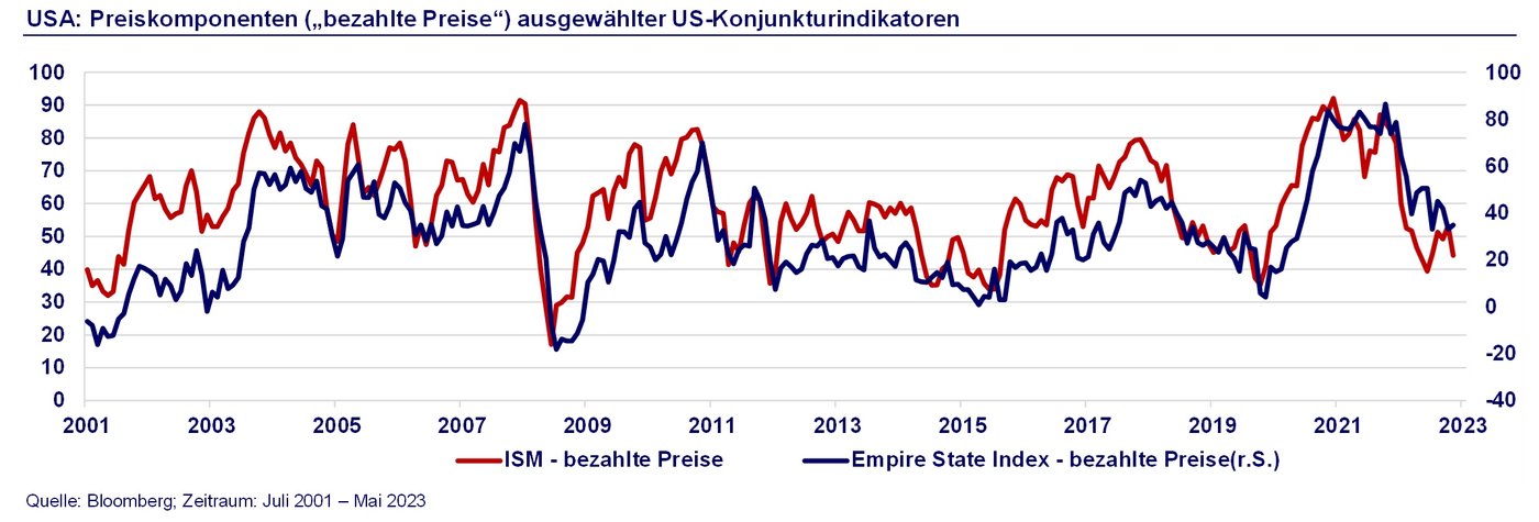 In Deutschland nehmen Import- und Erzeugerpreise Kurs auf deflationäre Werte. In den USA liefern die Preisdaten aus den nationalen und regionalen Einkaufsmanager- und Konjunkturumfragen Anhaltspunkte für nachlassende Teuerung. Die entsprechenden Preiskomponenten im ISM, aber auch den regionalen Indizes wie Philadelphia Fed, Empire State Index oder Chicago PMI zeigen derzeit eine deutliche Abwärtsdynamik.