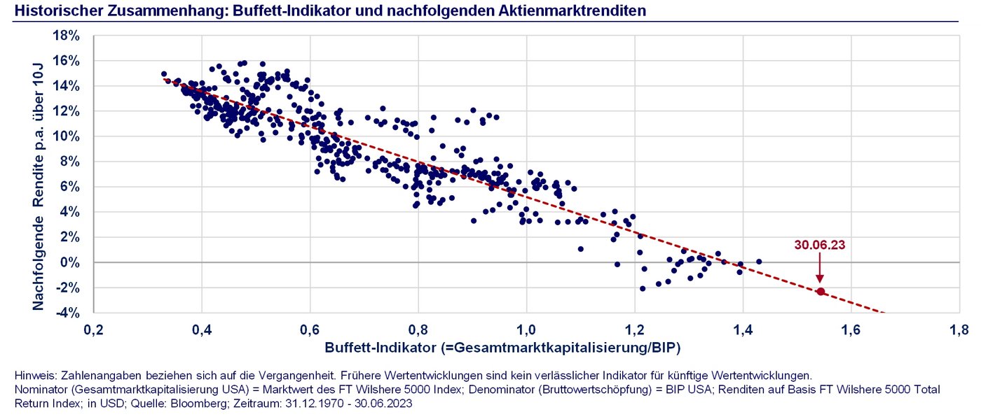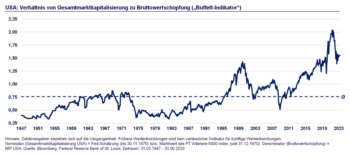 Grundsätzlich bleiben die Aktienmärkte, speziell in den USA, teuer. Alle gängigen Indikatoren, die sich zur Beurteilung der Bewertung des Gesamtmarkts eignen, zeigen für die US-Märkte hohe bis sehr hohe Überbewertungen. Historisch gingen hohe Ausgangsbewertungen zum Beginn einer Investitionsperiode stets mit nachfolgenden niedrigen, enttäuschenden Gesamtertragserwartungen einher. Auf diese stabile und verlässliche Beziehung hatten wir in vergangenen Quartalsberichten immer wieder hingewiesen. Beispielhaft liegt Warren Buffets bevorzugter Bewertungsindikator, die Gesamtmarktkapitalisierung im Verhältnis zur Bruttowertschöpfung, deutlich oberhalb des langfristigen Durchschnitts.