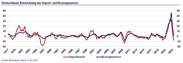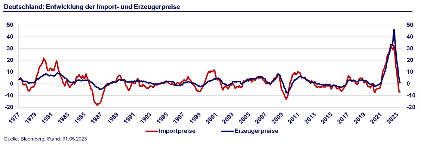 Viele Daten bestätigen aktuell den Trend zu rückläufiger Inflation. Üblicherweise verlässliche Indikationen für die künftige Richtung der Verbraucherpreise ergeben sich aus "vorlaufenden Preisdaten", wie Importpreisen, Großhandelspreisen oder Erzeugerpreisen. Gerade die wichtigen Produzentenpreise, die mit einiger Zeitverzögerung einen Großteil der Veränderung der Inflation erklären, sind in Europa und den USA zuletzt sehr deutlich gesunken.