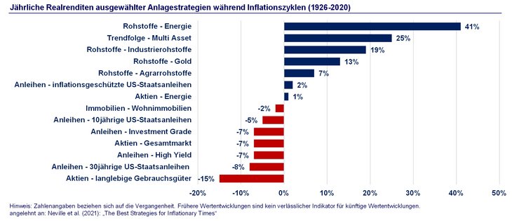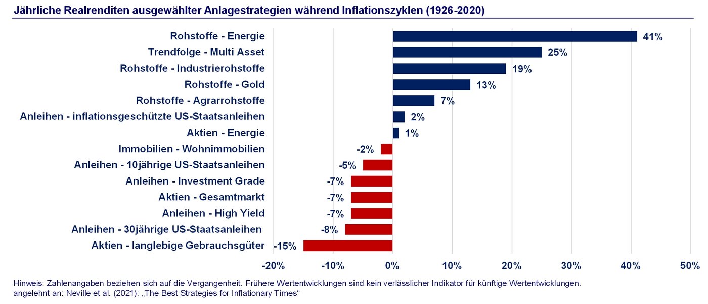 Zu vergleichbaren Erkenntnissen gelangen Neville et al. in ihren Arbeiten "The Best Strategies for Inflationary Times" (Henry Neville, Teun Draaisma, Ben Funnell, Prof. Campell Harvey, Otto van Hemert in: Journal of Portfolio Management August 2021). Sie zeigen in ihrer Untersuchung acht inflationärer Regime zwischen 1926 und 2020 das typische Verhalten unterschiedlicher Anlageklassen und -stile und bestätigen die Erkenntnis, dass die beiden traditionellen Anlageklassen – Aktien und Renten – in solchen Marktphasen wenig robust sind. Lediglich mit ausgewählten Selektionsansätzen innerhalb der beiden Assetklassen – z.B. Energiewerten bei Aktien oder inflationsindexierten Anleihen auf Rentenseite – konnte eine gewisse Inflationsresistenz erreicht werden. Die eindeutig resilienten Vermögenswerte in Inflationsphasen sind aber auch dieser Untersuchung nach wenig überraschend Gold und Rohstoffe.