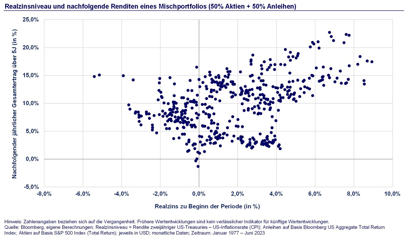 Was bewertungsseitig für Aktien gilt, gilt im breiteren Kontext ganz grundsätzlich auch für Multi-Asset Portfolien: Die Bewertungen von heute sind die Renditen von morgen. Den Bewertungsanker für faktisch alle Anlageklassen bildet der Realzins zum Ausgangszeitpunkt einer Investition. Hohe, positive Realzinsen gehen einher mit nachfolgend ansprechenden Erträgen in einem Mischportfolio, umgekehrt haben niedrige oder gar negative Realzinsen stark prädiktiven Charakter für nachfolgend enttäuschende Gesamterträge.