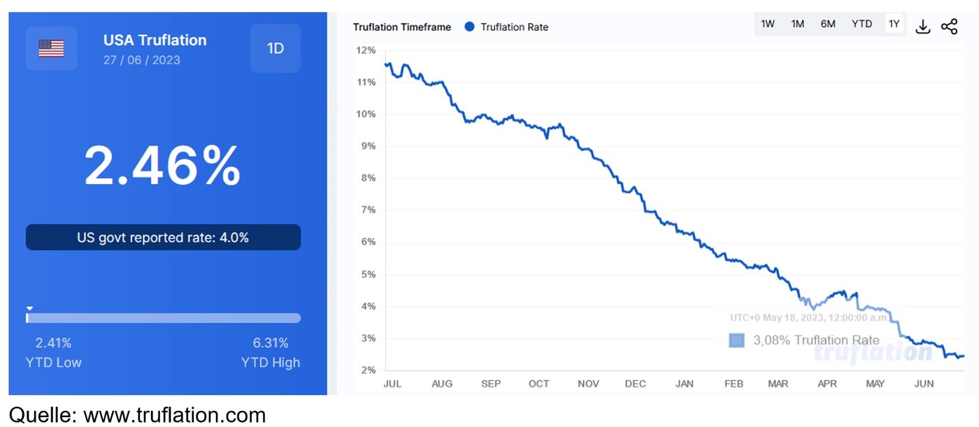 Speziell in den USA verzerrt die sehr hohe Gewichtung der Wohnkosten und deren fragwürdige Erhebungsmethodik die Aussagekraft des Verbraucherpreisindex. Sehr viel näher an den Lebensrealitäten und repräsentativen Warenkörben ist unserer Einschätzung nach die "Echtzeitmessung" des Datendienstes "Truflation", der mit Werten von nur noch 2,46% die rückläufige Tendenz der Preisanstiege bestätigt. Die Truflation-Messung liegt seit geraumer Zeit unterhalb der offiziellen Inflationsrate von zuletzt 4,0%.