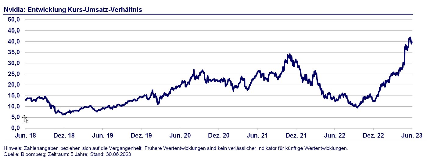Mit einem aktuellen Kurs-Umsatz-Verhältnis von 40 liegt die Bewertung der Nvidia-Aktie unserer Einschätzung nach weit außerhalb jeder nachvollziehbaren Norm. Selbst unter optimistischsten Grundannahmen für die künftige Geschäftsentwicklung des Technologiekonzerns scheint die Bepreisung der Aktie von wenig realistischen Hoffnungswerten getragen. Die aufgebaute Überbewertung trägt Merkmale der Blasenbildung vieler Internetaktien zur Jahrtausendwende. Einige der am stärksten geliebten und bewunderten Internetstars zu dieser Zeit wiesen dabei aber weniger extreme Überbewertungen auf: Sun Microsystems, einer jener Highflyer, hatte in der Spitze ein Kurs-Umsatz-Verhältnis von 10. Der damalige Unternehmenschef Scott McNealy brachte die in dieser Bewertung reflektierte Irrationalität und Maßlosigkeit der Anleger einige Jahre später wie folgt auf den Punkt: