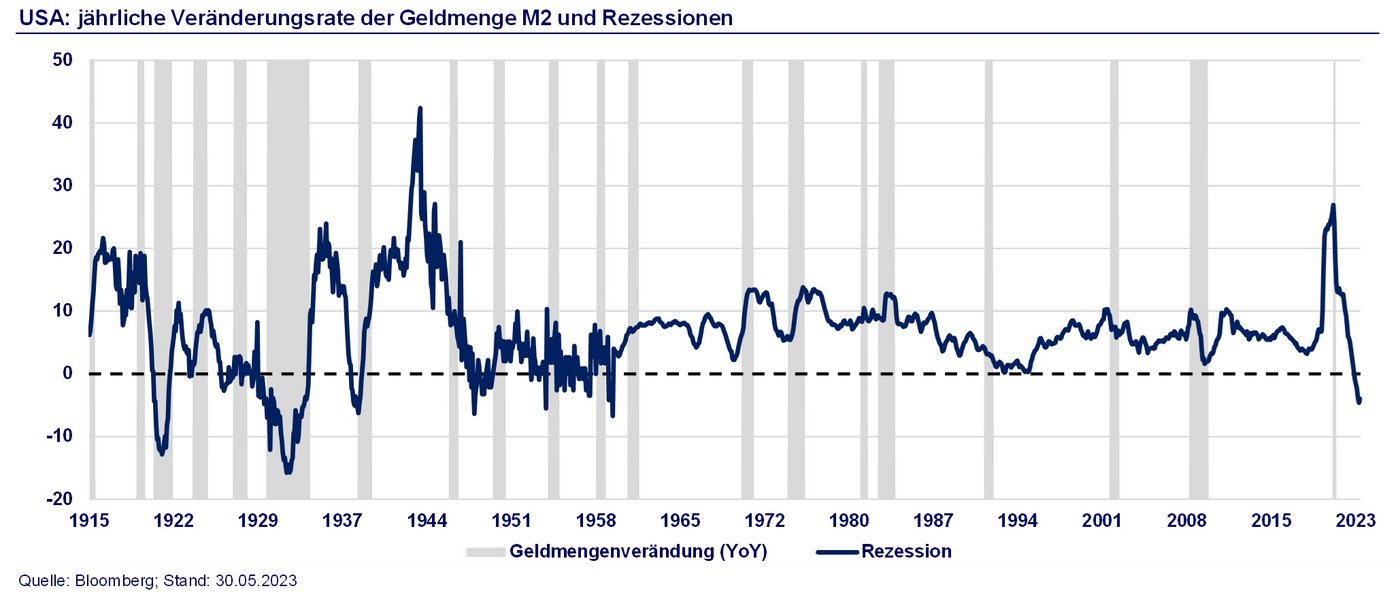 Die bereits eingeleitete Schrumpfung der Geldmengen wird über die kommenden Monate fortwirken. Die ihr folgende Kreditkontraktion bremst Nachfrage und Konjunktur. Schon die letzte veröffentlichte Umfrage zur Kreditvergabe in den USA (Senior Loan Officer Opinion Survey) zeigte eine deutliche Straffung der Kreditvergabekonditionen und gesamthaft Kreditbedingungen, die in Einklang mit einer Rezession stehen.