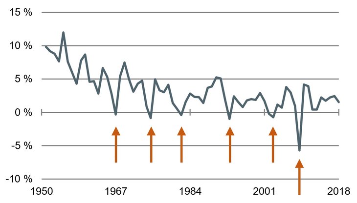 Seit dem zweiten Weltkrieg hat es in Deutschland sechs Rezessionen gegeben, in denen das reale BIP absolut zurückgegangen ist. Das waren jeweils aufregende Zeiten. Regierungen und Zentralbanken setzten alle Hebel in Bewegung, um den Einbruch in Grenzen zu halten.