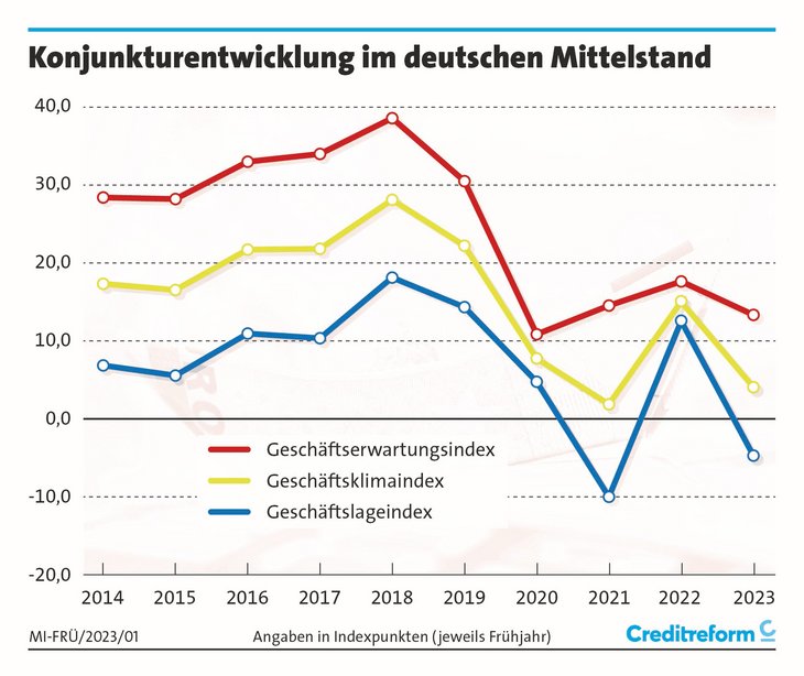 Dabei bringt der Creditreform Geschäftsklimaindex (CGK) die Vielzahl der Antworten zu den einzelnen betriebswirtschaftlichen Parametern wie Umsatz, Personalsituation oder die Ertragslage auf den Punkt. Der Index wird sowohl aus den Angaben zur aktuellen Geschäftslage wie auch zu den Erwartungen an den weiteren Fortgang der unternehmerischen Situation errechnet. Die aktuelle Geschäftslage zum Ausgang des Winters liegt mit minus 4,8 Punkten wieder im negativen Bereich, wie zuletzt im Zeichen der Corona-Krise im Frühjahr 2021. Im Vorjahr kletterte die aktuelle Bewertung noch auf ein Plus von 12,5 Punkten. Nach dem Ende des Lockdowns und als noch nicht abzusehen war, welche Rolle die kriegerische Auseinandersetzung in Osteuropa spielen würde, schien die Konjunktur in Deutschland auch für den Mittelstand wieder angesprungen zu sein. Immerhin sind die Erwartungen 2023 überwiegend positiv. Allerdings liegt man in der Bewertung mit 13,3 Punkten noch deutlich unter dem Optimismus des Vorjahres (plus 17,6 Punkte). Rechnet man die aktuellen Bewertungen und die Erwartungen zum Geschäftsklimaindex zusammen, erhält man einen Wert von plus 4,0 Punkten (Vorjahr: plus 15,0 Punkte). Diese Zahl liegt zwischen den Krisenwerten von 2020 mit plus 7,7 Punkten sowie 2021 mit plus 1,8 Punkten und beträgt nur ein Fünftel der Werte in den "normalen Jahren" zwischen 2016 und 2019.