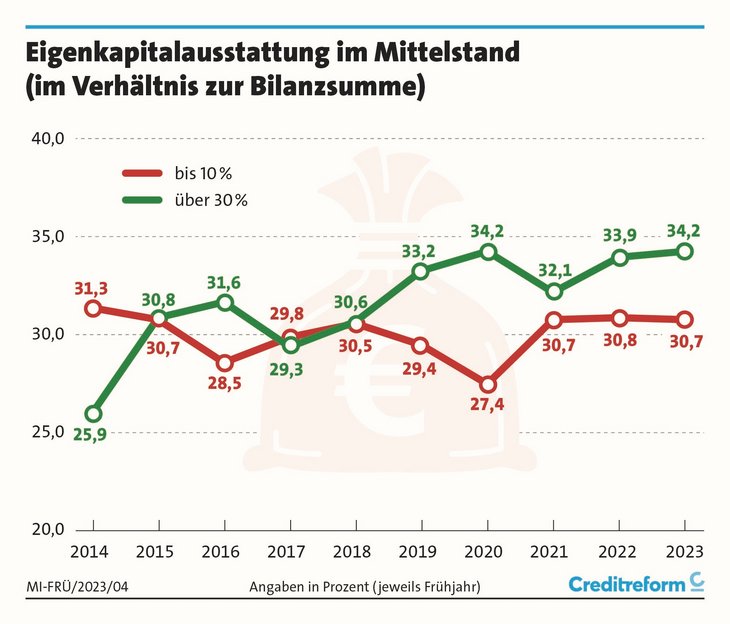 "Mit der Energiepreisexplosion kamen für den Mittelstand neue Belastungen hinzu. Das bremste die Erholung nach der Corona-Krise", erklärt Hantzsch. Ein Teil des Mittelstandes habe die Eigenkapitalquoten zuletzt wieder verbessern können. Gut jeder dritte Befragte (34,2 Prozent) hatte eine Eigenkapitalquote von über 30 Prozent gemeldet und gilt damit als eigenkapitalstark. Viele Unternehmen (30,7 Prozent) leiden aber weiterhin unter einer niedrigen Eigenkapitalquote von unter 10 Prozent. "Die mit der Gießkanne ausgeschütteten staatlichen Hilfen werden für viele Betriebe jetzt zum Corona-Bumerang, der sie in einem extrem ungünstigen Marktumfeld trifft."