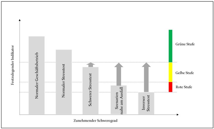 Das in der Praxis zu beobachtende Phänomen ist hier relevant, dass die richtigen Szenarien zum richtigen Zweck passen müssen. Je extremer die Stressszenarien werden, desto mehr fließen sie in die Sanierungsplanung der Banken ein, wo drastischere Maßnahmen, wie beispielsweise der Verkauf eines Geschäfts, erforderlich sein können, um die Bank zu sanieren. An der Grenze kann ein Stress so schwerwiegend sein, dass er die Bank über den Punkt der Nichtlebensfähigkeit hinaustreibt, was bei vielen Banken der Ansatz für die Abwicklungsplanung ist. Dieses Stresskontinuum, das von relativ milden Stresssituationen für das tägliche Risikomanagement bis hin zu einer geordneten Abwicklung reicht, setzt eine Reihe konsistenter interner Limits, Eskalationsprotokolle und entsprechender Gegenmaßnahmen voraus (vgl. Abb. 01). Die Autoren empfehlen, rückwärts zu arbeiten: Nachdem der Punkt der Nichtlebensfähigkeit für die Abwicklungsplanung festgelegt wurde, was ist dann der Punkt, an dem das Management das Glas zerbrechen und einen Sanierungsplan umsetzen muss?
