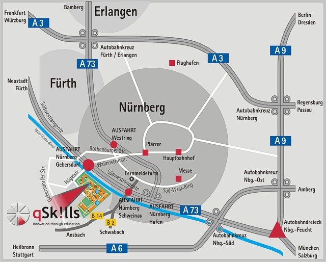 Mit der Bahn: Hauptbahnhof: R-Bahn R7 Richtung Ansbach - 2 Stationen, ca. 7 Minuten, Nürnberg Stein: Fußweg (ca. 5 Minuten)