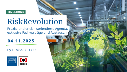 Die Funk-Gruppe und BELFOR lädt am 4. November 2025 zur Veranstaltung "RiskRevolution" auf dem RWTH Aachen Industriecampus ein. Mit RiskRevolution sollen innovative Lösungsansätze aufgezeigt werden, um den vermeintlichen Widerspruch zwischen Nachhaltigkeits- und Resilienz-Anforderungen sowie dem zunehmenden Druck auf Unternehmen, wettbewerbsfähig und wirtschaftlich zu bleiben, zu überwinden.