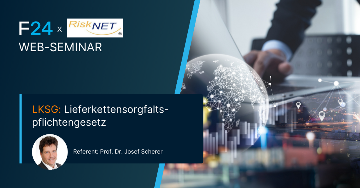 Melden Sie sich zu unserem Web-Seminar in Kooperation mit RiskNET an, um wichtige Einblicke in die Auswirkungen des Lieferkettensorgfaltspflichtengesetzes, Lösungsansätze für die Praxis und die Möglichkeit zur Diskussion mit einem Experten zu erhalten. Prof. Dr. Josef Scherer deckt im Web-Seminar alle wichtigen Aspekte ab: